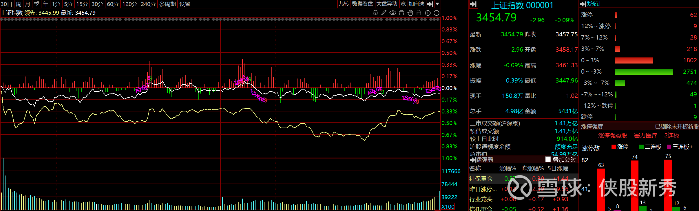 三大指数延续弱势震荡,市场成交量相对于昨日缩量至1.37万亿,银行继续如日中天般的上涨,整体市场涨少跌多,亏钱效应进一步扩大。 短线这边,海洋经济上午爆发,光伏下午爆发,老热点题材上演次日无溢价坑人轮动,热点之争军工批量核按钮,芯片前排坚挺中后排核按钮,昨日避险的化工和医药同样是上演板块内部的无溢价轮动,整体短线情绪延续分歧第二日。 涨停家数59较昨日63有所下降,封板成功率79%较昨日70%有所上升,连板梯队12只较昨日15只有所下降。