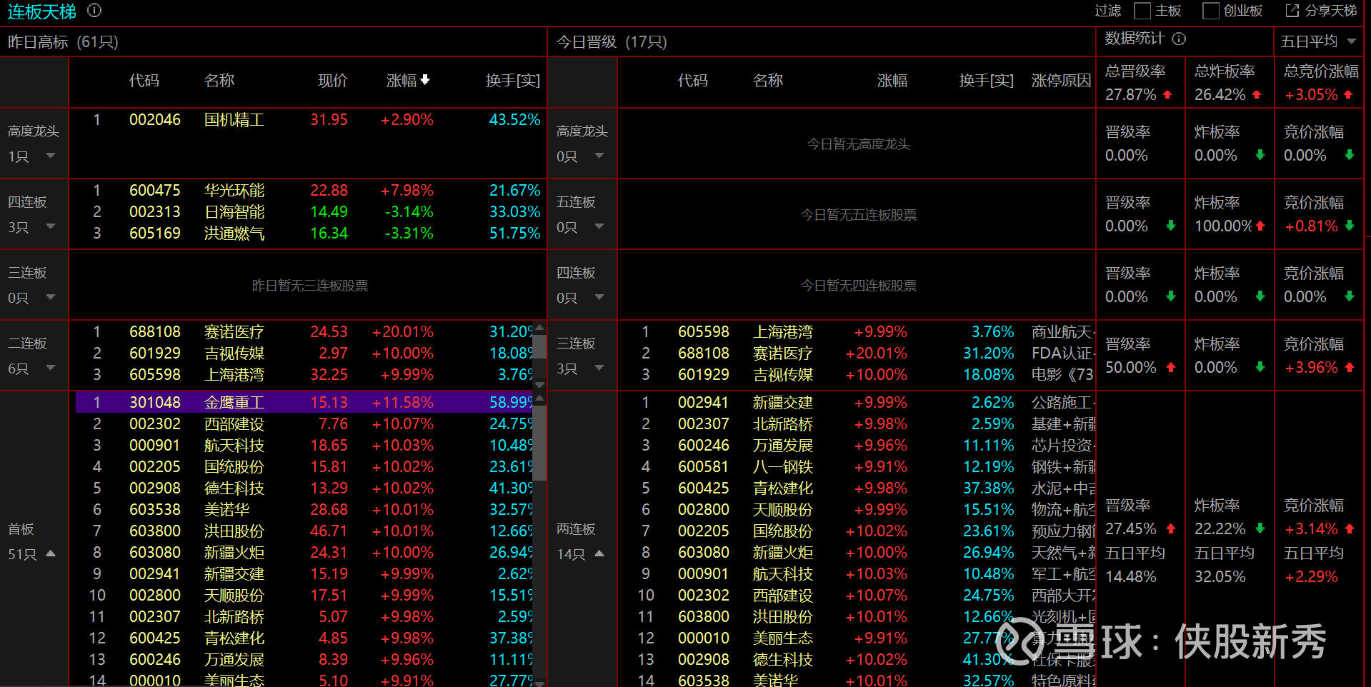 连板梯队: 3板:吉视传媒 (AI应用、731)、上海港湾 (连云港 、商业航天、电池)、赛诺医疗 (医药) 2板:美丽生态 (算力、基建)、航天科技 (商业航天)、国统股份 (基建)、西部建设 (基建)、北新路桥 (基建)、天顺股份 (基建)、德生科技 (社保)、新疆交建 (基建)、万通发展 (芯片)、青松建化 (基建)、八一钢铁 (基建)、新疆火炬 (基建)、美诺华 (医药)、洪田股份 (电池、PCB)