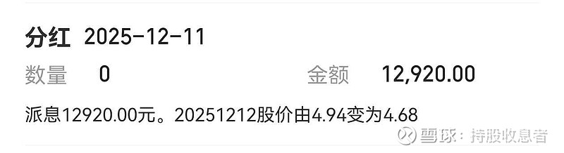 $XD南山铝(SH600219)$ 20251211晚上南铝特别分红到账。10派2.584元,我持有5万股,分红12920元。除权后,开盘价由4.94变为4.68。去年分红半年报、三季报、年报,0.4+0.4+0.9=1.7,股息率0.17÷4.68=3.63%。今年分了半年报、特别分红,0.4+2.584=2.984,已经远超去年。