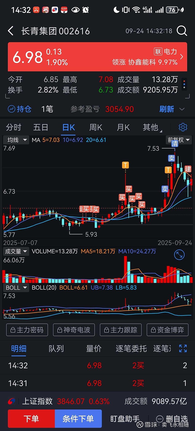 感谢主力,结束第二次战斗,昨天没买到最低价,只吃到6个点,不过还很满意了。