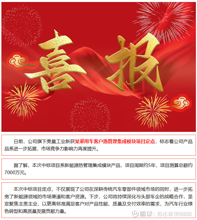喜报 | 公司旗下美晨工业新获某乘用车客户热管理集成模块产品定点