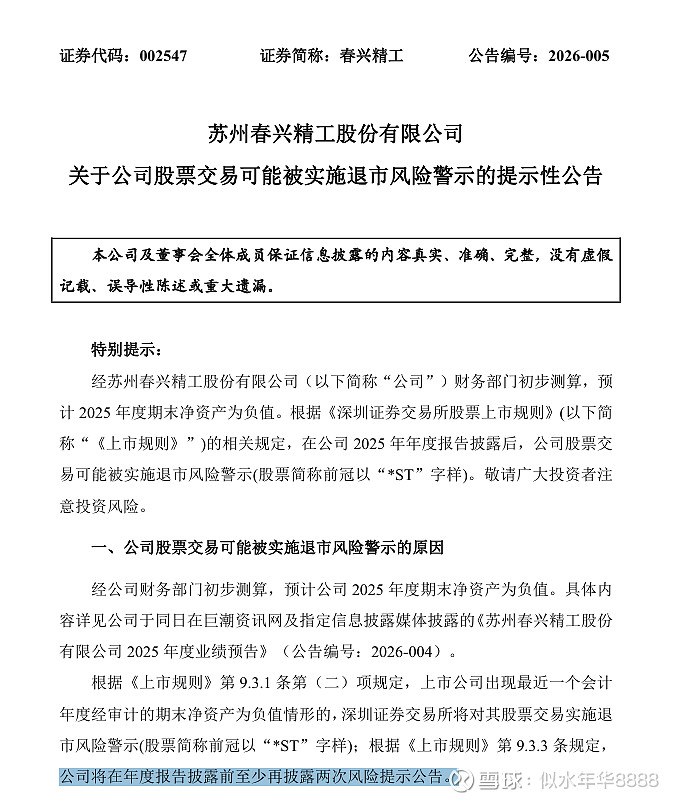 $春兴精工(SZ002547)$ 刚电话咨询了公司,为何今年2月份没有退市风险的公告,公司的回复是这个是除了第一次业绩预告的提醒外,其他月份是非必要提醒的。