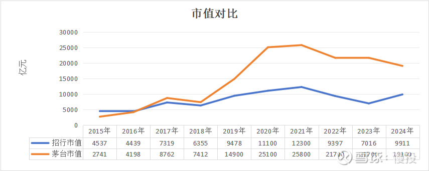 别着急犟,我们拿数据说话,招行2015-2024年期间,净利润是茅台的二倍还多,然而市值这几年却长期只有茅台的一半,这两年追上一些,但依然只有是60%左右(1.05/1.78)。