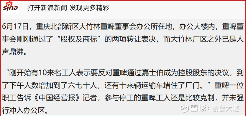 据说,当年嘉士伯与重啤敲定这件事时,很多娘家人直接不干了。在工厂大门口,工人停工抗议、拒绝嘉士伯收购。