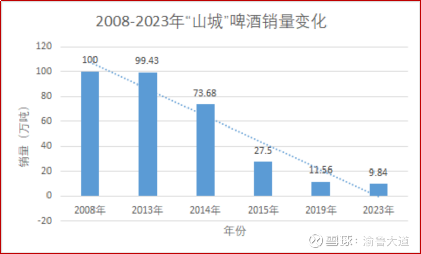 2013年,山城啤酒产销量为100万吨,2014年下滑为73.68万吨,2019年继续跌至11.56万吨。至2023年,山城啤酒和其他经济型啤酒合共销量才9.84万吨,较2013年缩水90%以上。