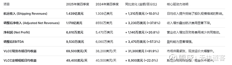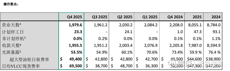 •2025年第四季度,该公司日均综合租船等效收益达60,300美元,其中:在现货市场运营的超大型油轮(VLCC)日均收益69,500美元,定期租船的VLCC日均收益49,400美元。