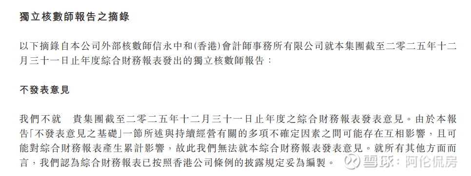 如此天崩地裂的数据,以至于独立核数师信永中和(香港)就中国奥园2025年财报发出的独立核数师报告是——不发表意见!