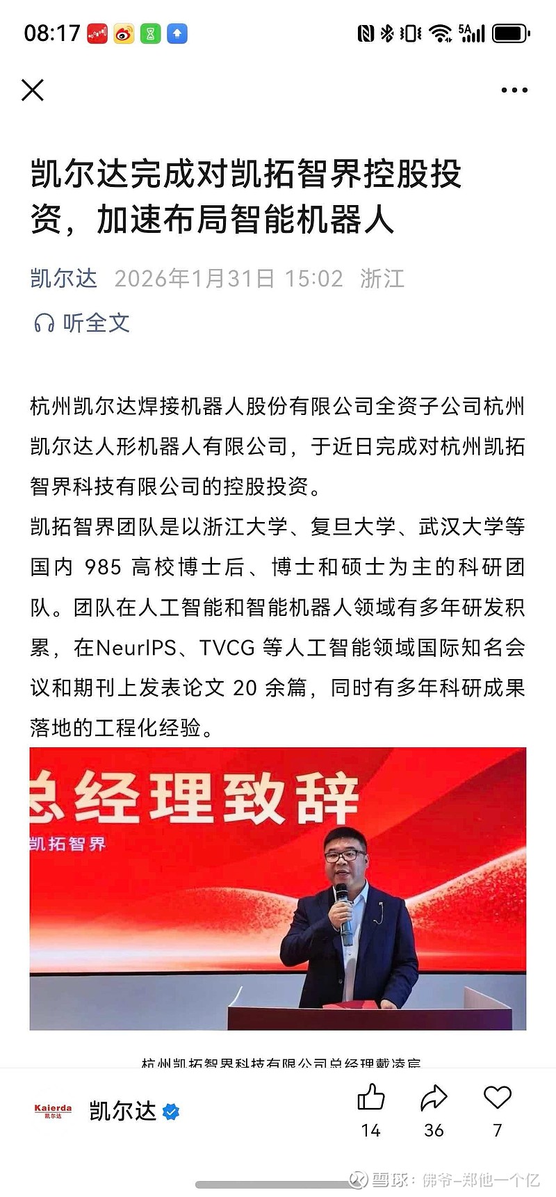 2026年1月31日 15:02 浙江 听全文杭州凯尔达焊接机器人股份有限公司全资子公司杭州凯尔达人形机器人有限公司,于近日完成对杭州凯拓智界科技有限公司的控股投资。