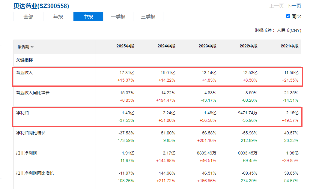 财报显示,贝达药业上半年实现营业收入17.31亿元,同比增长15.37%;归母净利润1.40亿元,同比下滑37.53%。这是公司自2022年之后,首次在半年报出现净利润同比下滑现象。