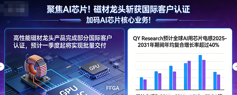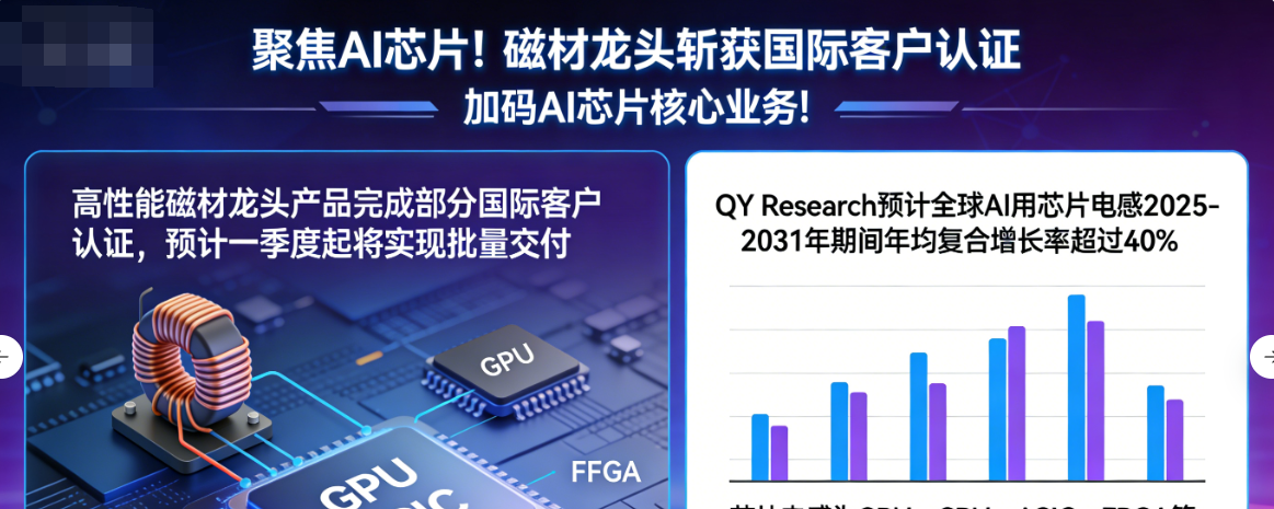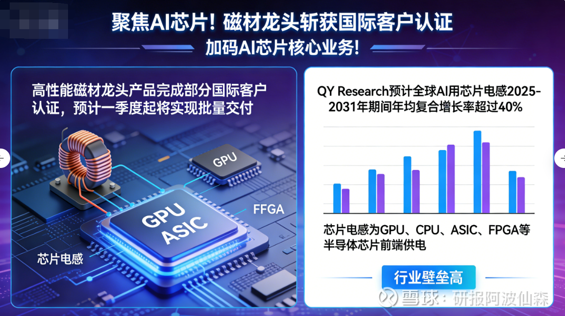 加码AI芯片核心业务!这只高性能磁材龙头产品完成部分国际客户认证,预计一季度起将实现批量交付,QY Research预计全球AI用芯片电感2025-2031年期间年均复合增长率超过40%。 芯片电感起到为GPU、CPU、ASIC、FPGA等半导体芯片前端供电作用,行业壁垒高。