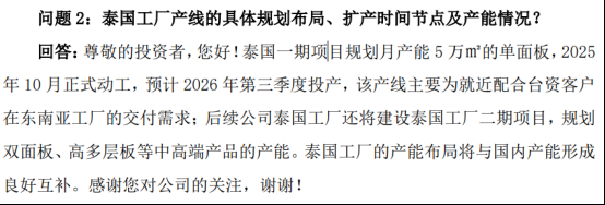 泰国工厂的总产能规划目标是400万平米/年,涵盖了单层板,双层板,高多层板等多个档次,多种产品。