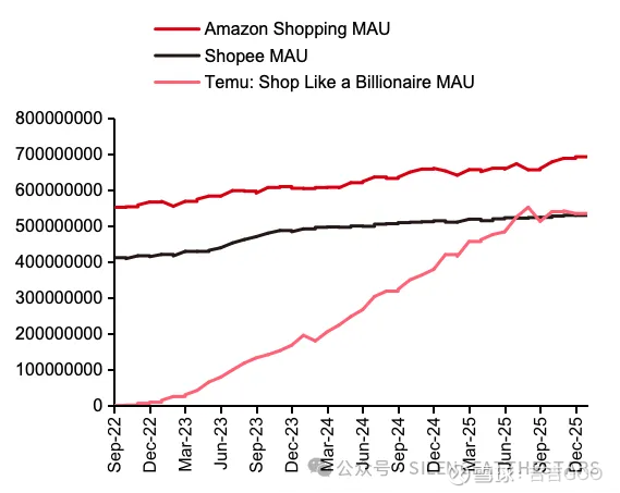 用户是电商发展早期的最核心指标,有用户就有单量和GMV,26年1月TEMU的MAU5.37亿,已是Amazon6.9亿的78%。