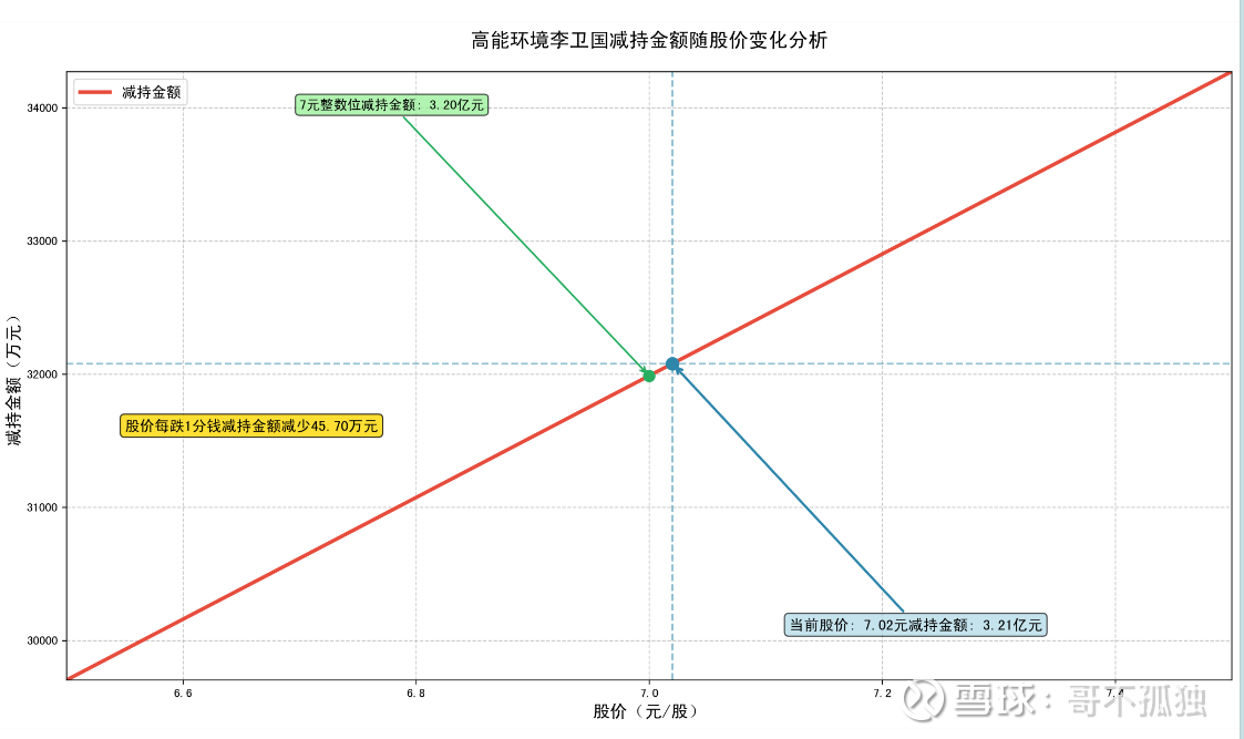 当前情况:即使股价维持在7元或小幅下跌,李卫国仍可完成约3.2亿元的套现目标,但相比7.02元股价的3.20亿元预期,将减少约1万元。