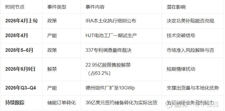 阿特斯2026年关键风险事件时间表梳理,共涉及三大类6项核心节点,当前股价已部分反映悲观预期,但多数冲击属短期扰动。