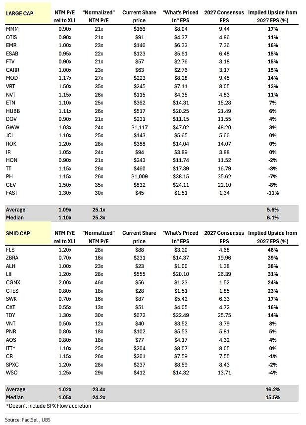 尽管目前 XLI 的远期市盈率达到 27 倍,处于历史高位,但瑞银认为仍有进一步上涨空间,因:超过70%的覆盖公司,市场对2027年每股收益的共识预期均高于瑞银框架测算出的“市场已定价”盈利水平。