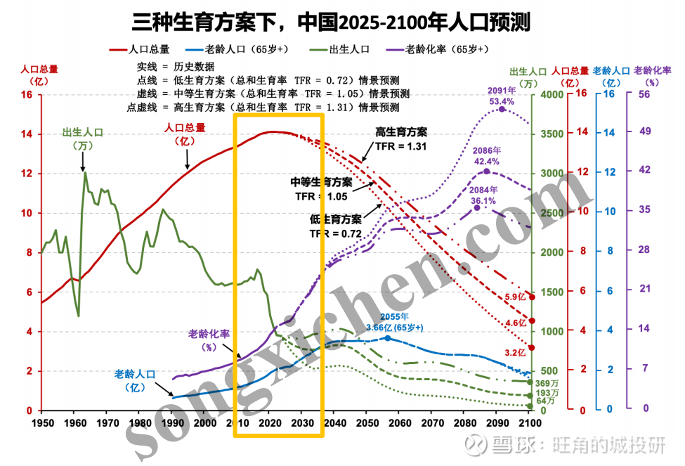 前段时间开会让大家知道了含科量这个未来的重点指标,十月就是十五五定稿公布的时间,这个纲要可能比大家认知的更加重要,因为十五五是最重要的一段转型时期,也是我们仅有的最后一个关键窗口期,为什么这么说大家可以看看去年西财和清华一起出2025-2100年人口预测报告,可以看到所有拐点都会在2030年之前到来,并在2030年后斜率加速,因此这个时间节点前我们需要尽可能的做更多的事情,越往后阻力就会越大,越被人口结构的问题掣肘。