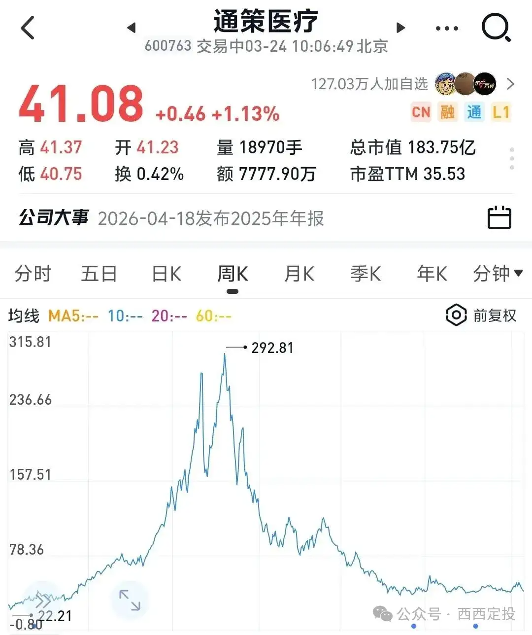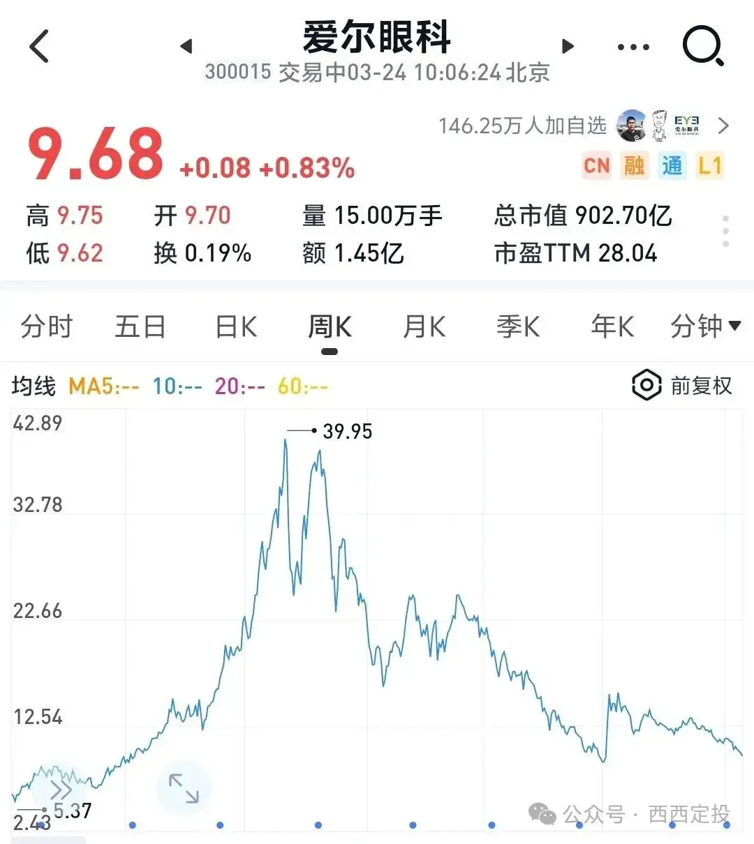 再来说说当初被吹上天的医疗双雄,爱尔眼科和通策医疗。爱尔眼科从40跌到10元,跌了75%,通策从291跌到41跌了85%,这两只股票当时的市盈率是接近200倍。