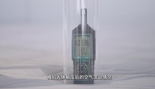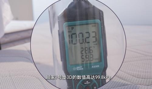 透气散热方面,测评使用了密封道具模拟人体躺压后的空气流动情况,气压计的读数可直观反映床垫透气性,气压变化越接近环境大气压说明床垫越透气。测试当天环境大气压为101kPa,测试结果显示顾家1号垫3D版床垫的数值高达100.23kPa。