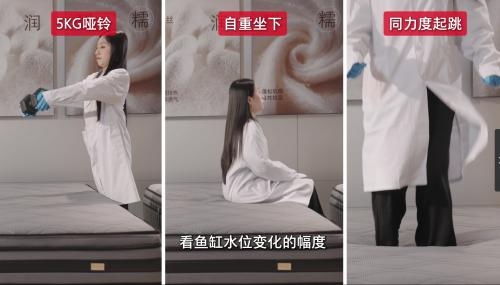 抗干扰性方面,测试主要通过放5公斤哑铃、坐下、起跳和搭积木4项测试对3款床垫进行测评。其中,具有显著差异的是起跳测试,测评过程中分别在3个床垫的一侧放置玻璃鱼缸,另一侧由测评者在相同位置以相同力度起跳,观察发现顾家床垫的水位变化小,其他产品的水位波动幅度大。