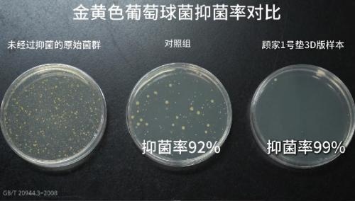 测试结果显示,对照组产品样本的螨虫趋避率仅为53.89%,不具备防螨效果。而顾家1号垫3D版样本则为78.21%,远超60%的国家标准;抑菌效果上,对照组产品样本对于金黄色葡萄球菌和大肠杆菌的抑菌率分别为92%和80%,顾家1号垫3D版样本对两种细菌的抑菌率均为99%。测试结果表明顾家床垫的抑菌防螨率远远超过国标。
