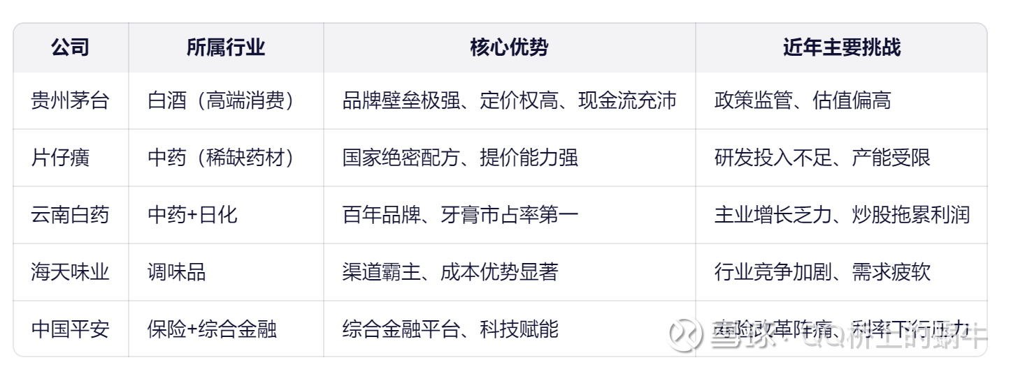 公司所属行业核心优势近年主要挑战贵州茅台白酒(高端消费)品牌壁垒极强、定价权高、现金流充沛政策监管、估值偏高片仔癀中药(稀缺药材)国家绝密配方、提价能力强研发投入不足、产能受限云南白药中药+日化百年品牌、牙膏市占率第一主业增长乏力、炒股拖累利润海天味业调味品渠道霸主、成本优势显著行业竞争加剧、需求疲软中国平安保险+综合金融综合金融平台、科技赋能寿险改革阵痛、利率下行压力