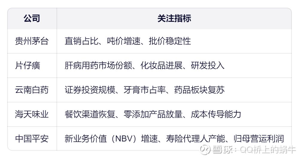 公司关注指标贵州茅台直销占比、吨价增速、批价稳定性片仔癀肝病用药市场份额、化妆品进展、研发投入云南白药证券投资规模、牙膏市占率、药品板块复苏海天味业餐饮渠道恢复、零添加产品放量、成本传导能力中国平安新业务价值(NBV)增速、寿险代理人产能、归母营运利润