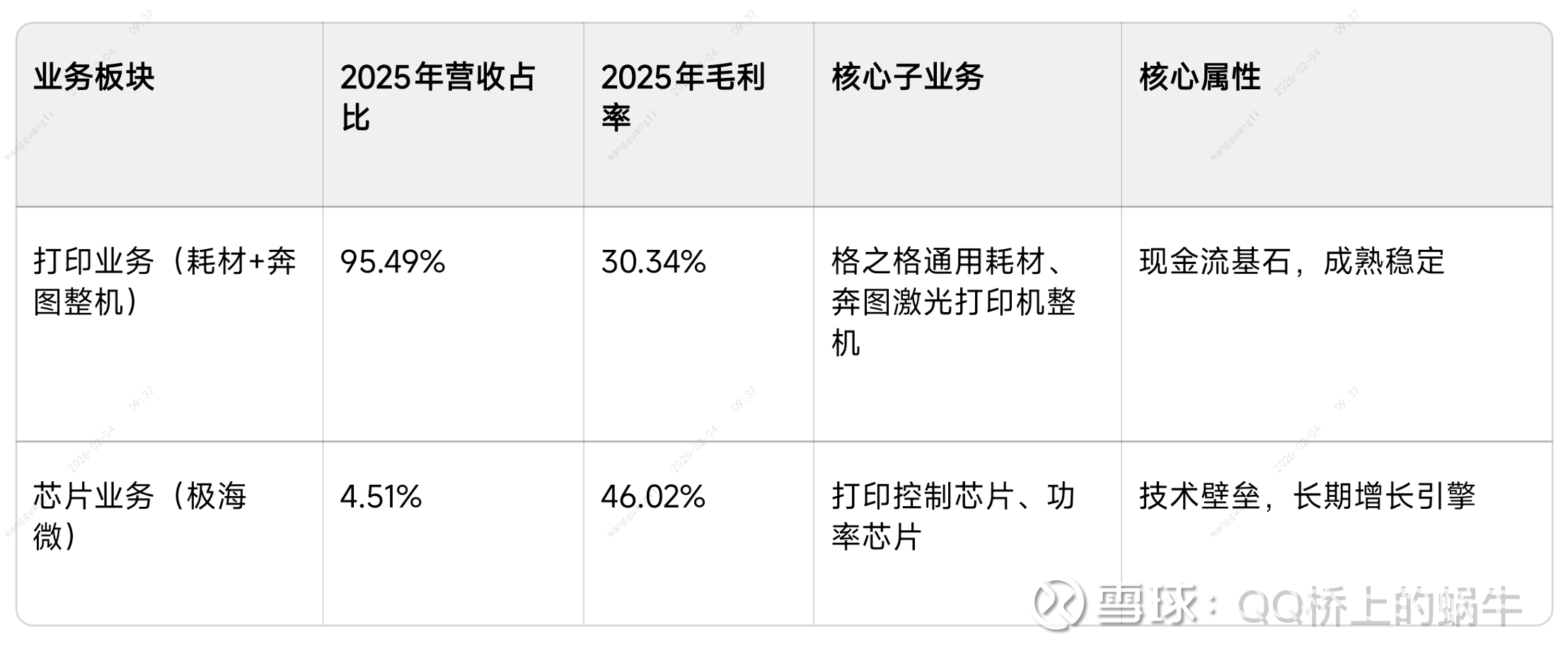 纳思达是全球打印成像行业的全产业链龙头,核心业务覆盖打印耗材(格之格)、激光打印机整机(奔图)、半导体芯片(极海微) 三大板块,是国内唯一实现 “耗材 - 芯片 - 整机” 全产业链自主可控的企业 —— 其 2025 年业务占比与毛利率结构清晰反映了各板块的盈利属性差异: