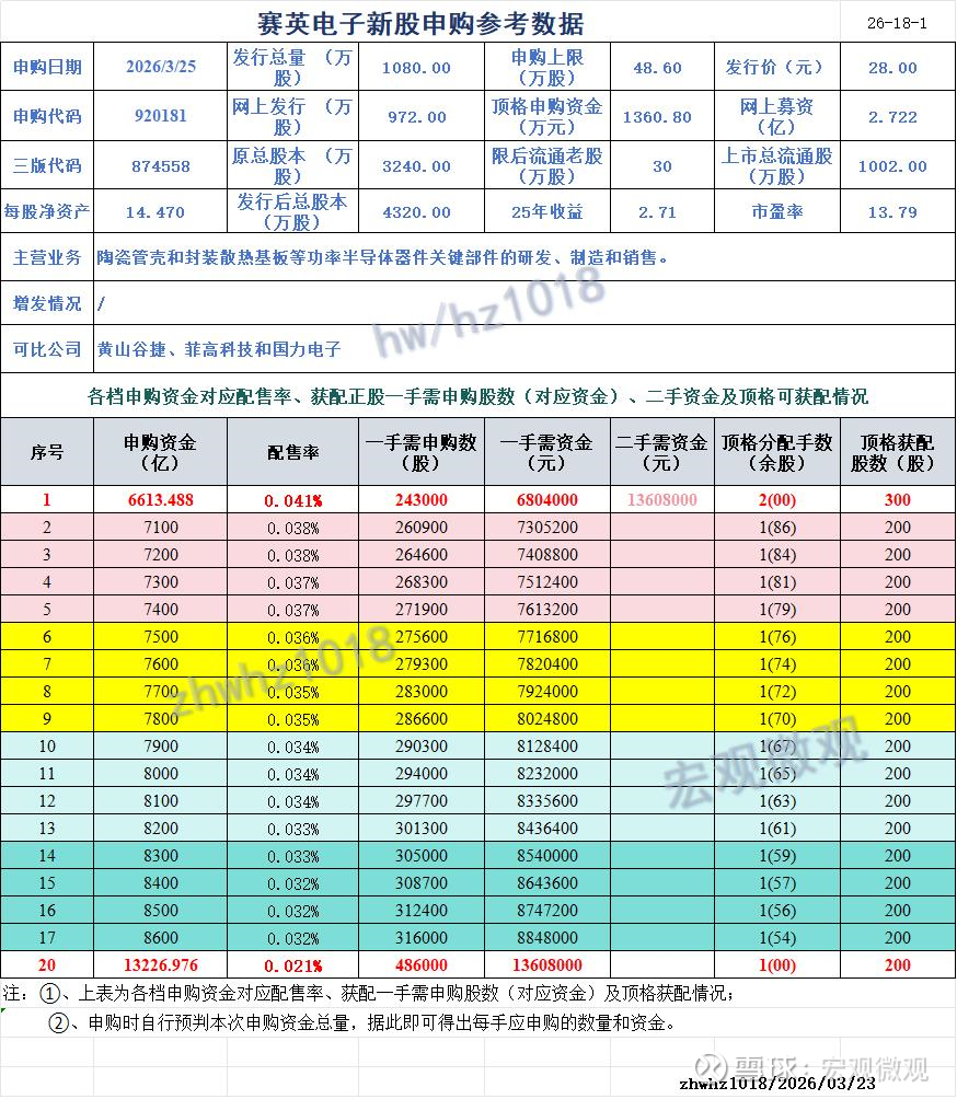 本次发行的【赛英电子】总部位于江苏省无锡市江阴市,主营业务陶瓷管壳和封装散热基板等功率半导体器件关键部件的研发、制造和销售。本次发行总量:1080万股,本次网上发行量:72万股(战投10%),发行价28.00元,申购上限48.60W股,顶格资金1360.8W,限后流通老股30.00万股。该股基本信息和《各档申购资金对应配售率、获配一手正股需申购股数和资金、顶格申购获配情况表》如下,供参与申购股友参考。