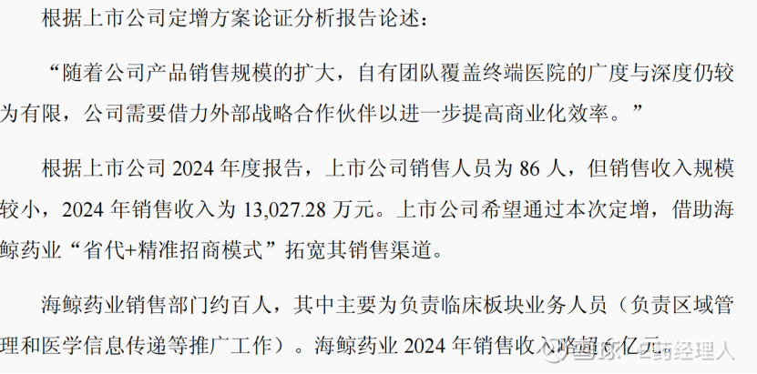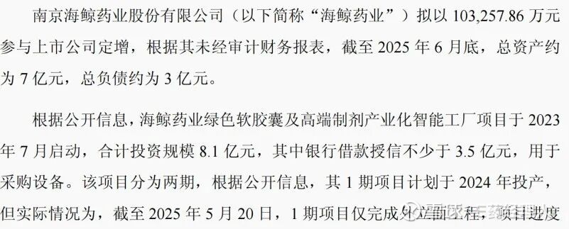 “定增资金来源”,这种最基础的问题首先被提出来,笔者认为这是在挑战现有公司高管智商的同时,也在挑战监管部门。据公开资料显示,海鲸药业2024年净利润达1.04亿元,资产总额6.33亿元,完全具备参与定增的实力。退一万步讲,即便现有资金不足,以现在国家对产业并购的支持力度,从国家到地方层面,已经出台了一系列政策举措,《政府投资基金布局规划和投向工作指引(征求意见稿)》、《上海市支持上市公司并购重组行动方案(2025—2027年)》。拿10个亿定增,对于海鲸不是难事。