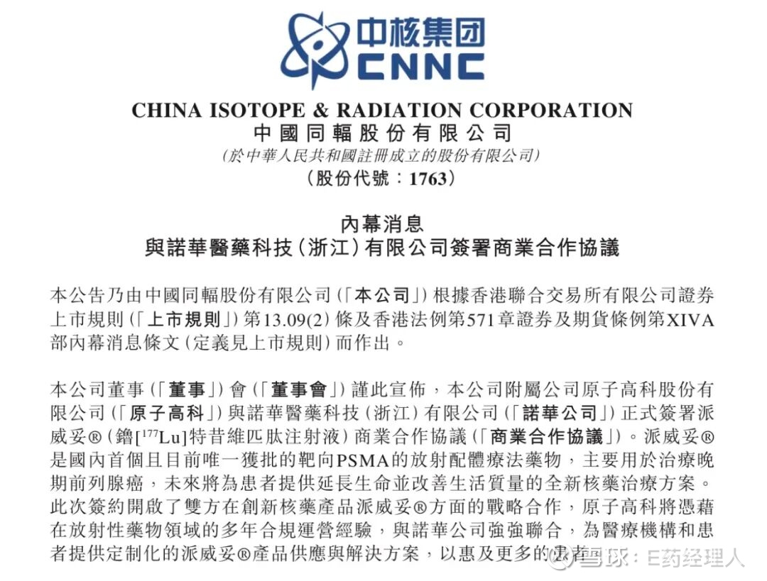 12月15日,中国同辐公告称,公司附属公司原子高科股份有限公司与诺华医药科技(浙江)有限公司正式签署诺华RDC新药派威妥商业合作协议。