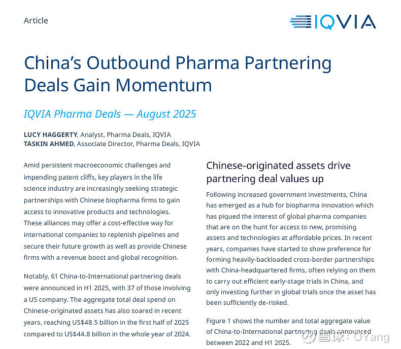 #药闻简讯# 今年上半年,全球制药企业与中国生物科技公司达成的合作交易金额高达485亿美元,远超2024年全年448亿美元的总额。这一惊人数据来自艾昆纬(IQVIA)对中国药企跨境合作交易的分析。若这一趋势持续,艾昆纬预计2025年全年交易量将轻松超越2024年签署的100项协议——仅今年上半年就已达成61项交易。