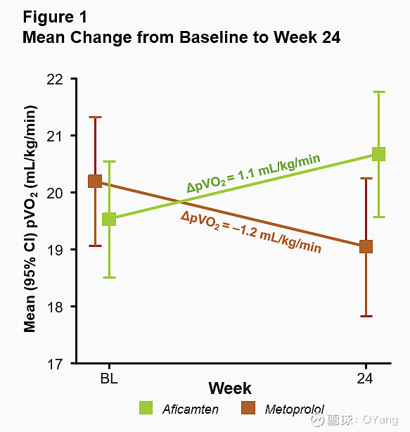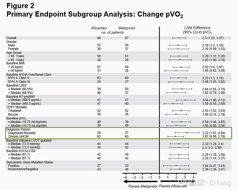 该研究的主要终点为治疗24周后,阿非卡门(aficamten)与美托洛尔(metoprolol)相比的峰值摄氧量(pVO₂)较基线的平均变化。阿非卡门组从基线至第24周的pVO₂平均变化为+1.1 mL/kg/min(95% CI 0.5至1.7),而美托洛尔组为-1.2 mL/kg/min(95% CI -1.7至-0.8)。两组的最小二乘均值(LSM)差异为2.3 mL/kg/min(95% CI 1.5至3.1;p<0.0001),主要终点具有统计学显著性(图1)。阿非卡门对pVO₂的改善效果在所有预设亚组中均保持一致,包括新诊断或未接受过治疗的患者(图2)。