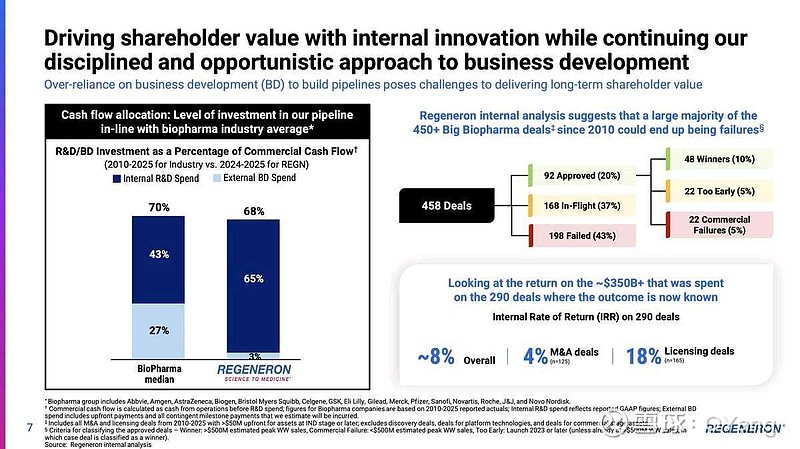 #药闻简讯# $再生元制药(REGN)$ 关于生物制药并购的回顾。在 2010 年以来的 450 多笔交易中……43% (仍在增加)失败,赢家超过 2 倍。在已知的 290 例中,内部收益率(IRR)仅为 8%,表现极为糟糕。许可的内部收益率(IRR)比并购高出约 4.5 倍@SeekingBiotech新药