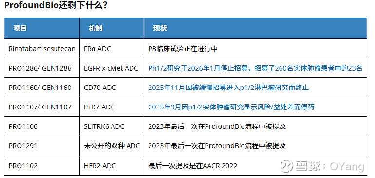 GEN1286被搁置之前,GEN1160和GEN1107最近也被终止,这意味着ProfoundBio普方生物唯一仍在积极开发的资产是rinatabart sesutecan,这是一种抗FRα抗体偶联药物(ADC),目前处于3期临床阶段,但正面临礼来LY4170156的竞争挑战。