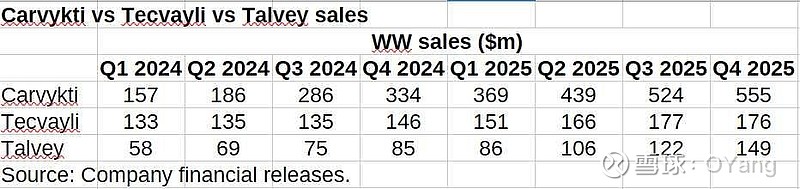 #药闻简讯# $传奇生物(LEGN)$ Carvykti、Tecvayli 和 Talvey 的销量对比。Tecvayli 的销量停滞Carvykti 如今已成为一家重磅药物,2025 财年销售额将达到 19 亿美元,而 2024 财年仅为 9.63 亿美元。$强生(JNJ)$