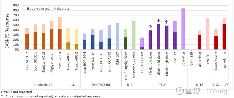 2)截至目前,$强生(JNJ)$ 的IL13+IL31组合疗法已失败(这是唯一直接与度普利尤单抗对照的试验),而$辉瑞(PFE)$ 的IL13+TSLP组合与UCB的IL13+IL17A/F方案虽显示出50%的安慰剂校正EASI75缓解率,但未设置度普利尤单抗对照组(历史EASI75数据约为35%)。