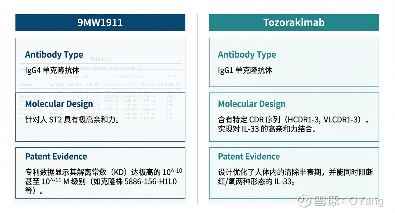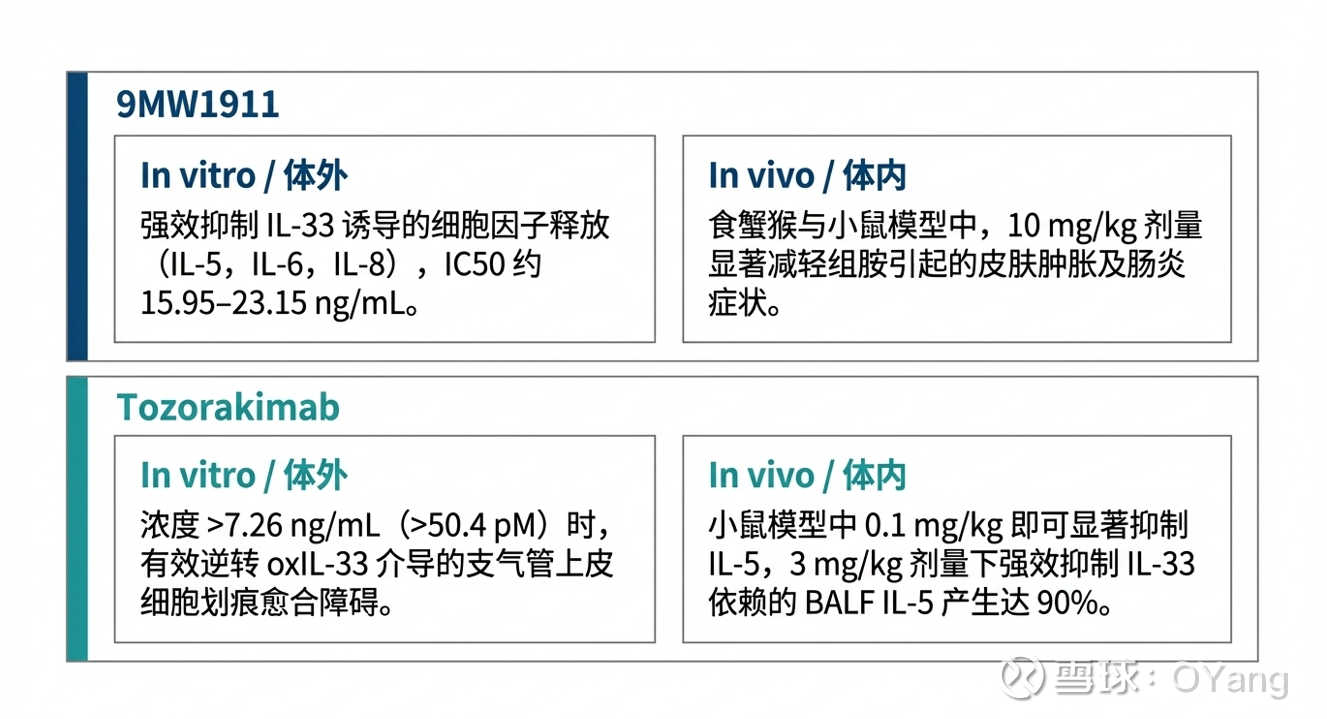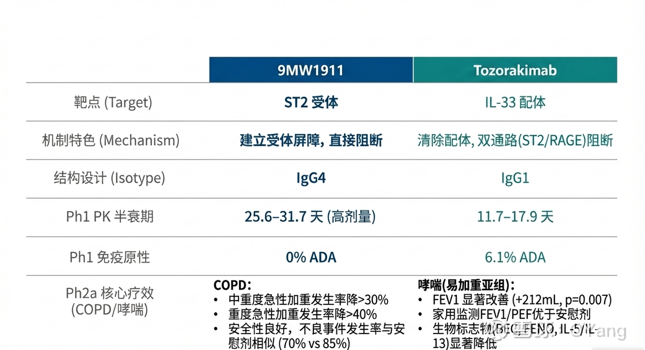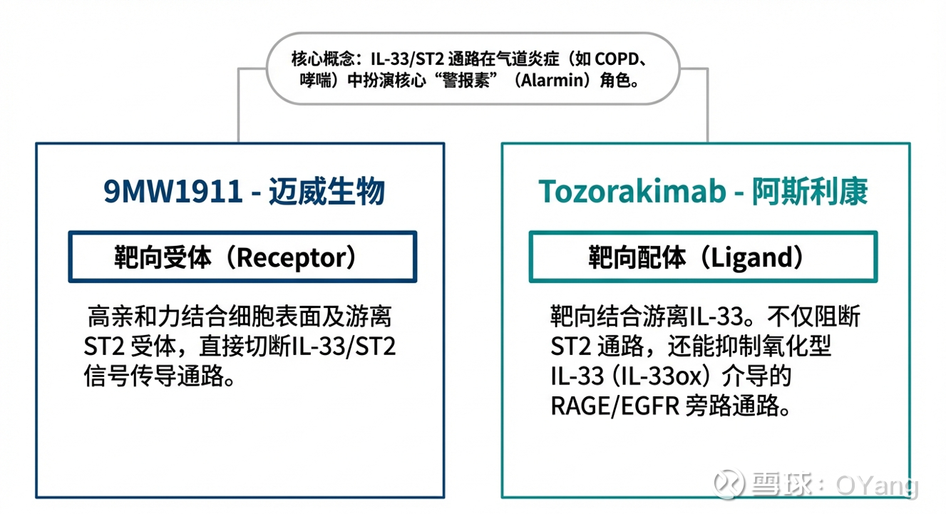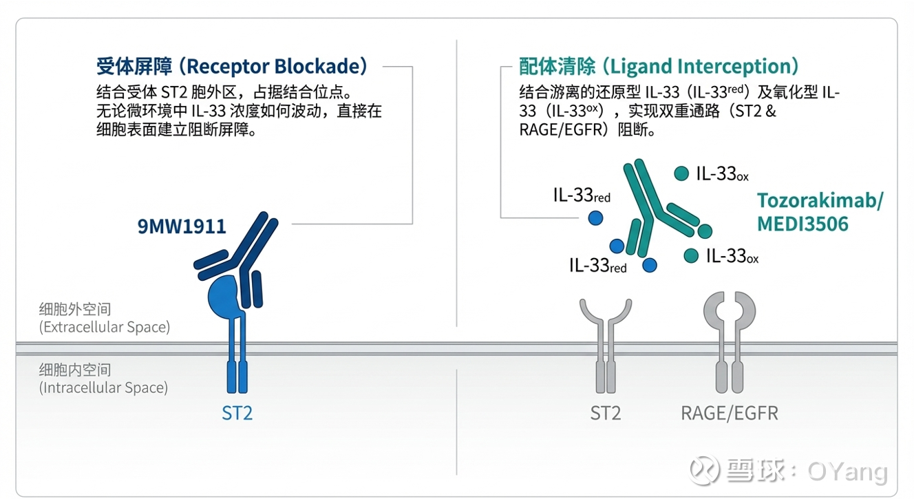 Tozorakimab是白细胞介素 (IL)-33 是炎症的驱动因子,也是一个极具潜力的治疗靶点。IL-33 以还原态 (IL-33red) 释放,并通过 ST2 受体传递信号。氧化和二硫键形成后生成 IL-33ox,后者通过新发现的 RAGE/EGFR 复合物传递信号。这与国内$迈威生物-U(SH688062)$ 9MW1911在通路设计上几乎吻合:与 ST2 特异性结合,阻断细胞因子 IL-33 对 ST2 介导信号通路的激活,抑制炎症反应的发生。