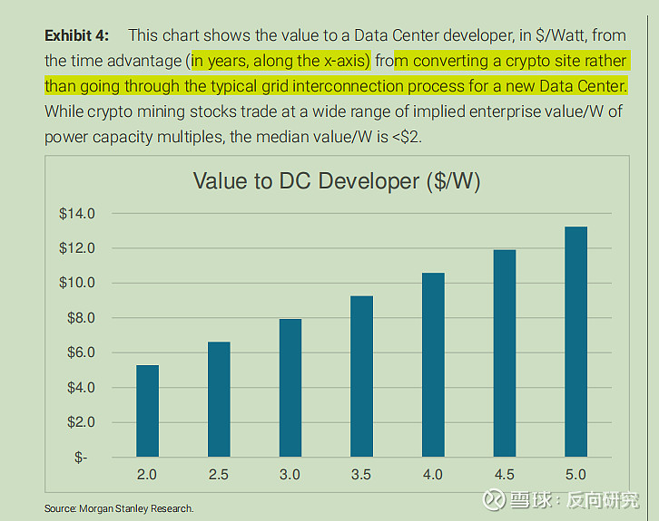 2、按照当下美股市场热衷的矿工转型AIDC逻辑看,50%的建设周期不要太逆天。按照大摩的算法,2年的效率提升意味着矿工的单瓦电力价值有5美金,其他时间维度的效率提升参考大摩的测算。