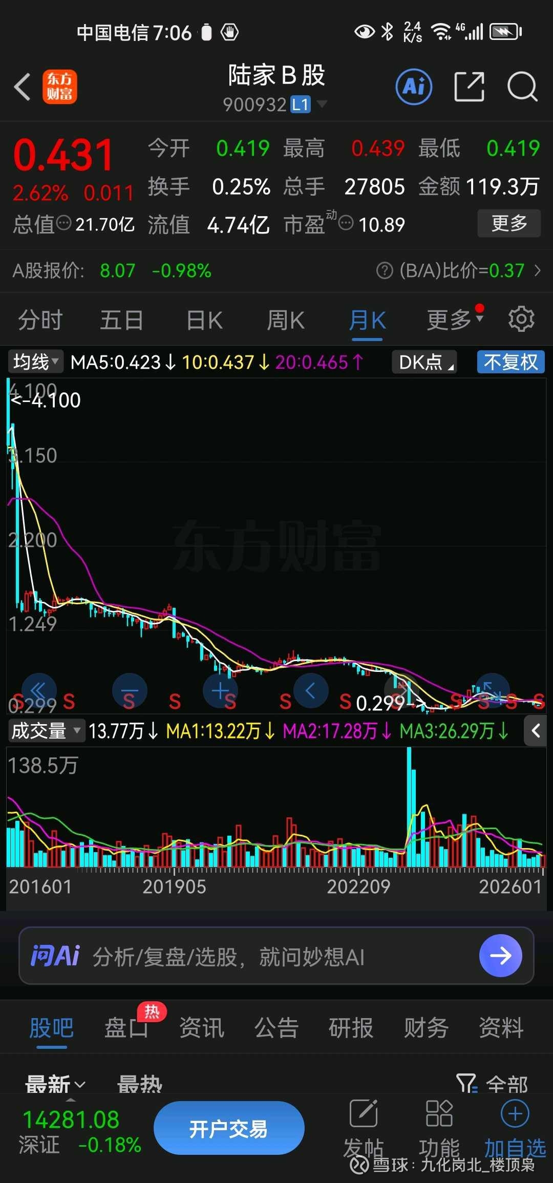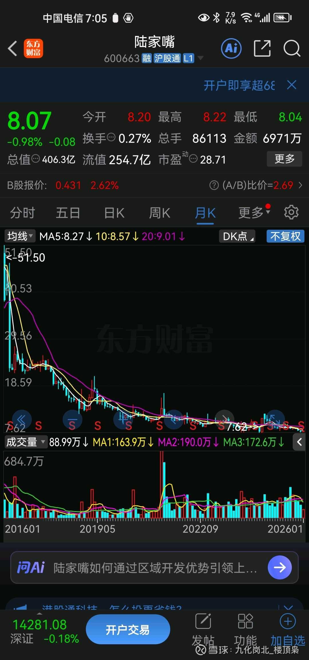 陆家嘴A股,陆家嘴B股。我以前就很迷信,那是上海最核心的区域,大多数一流金融企业的总部都在哪里荟萃。故事:平安当时要把总部迁移到上海陆家嘴,启动时,深圳市委闻讯,主动上门,用福田最好的一块地白白送给平安留下它。