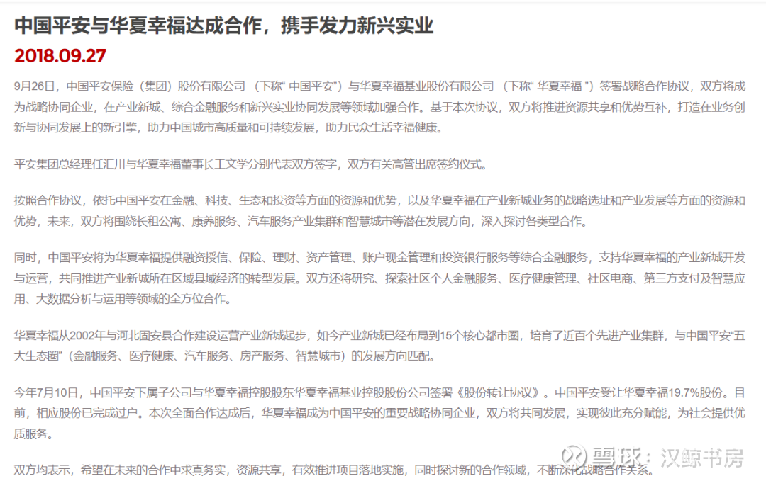 2018年,因环京楼市限购,华夏幸福住宅业务遭受重创,资金压力巨大,在相关方面介绍,2018年7月中国平安以白马骑士的身份入股华夏幸福,华夏幸福的控股股东华夏控股(实控人王文学)与平安资产管理有限责任公司签订《股权转让协议》,标的股份23.655元/股,转让价