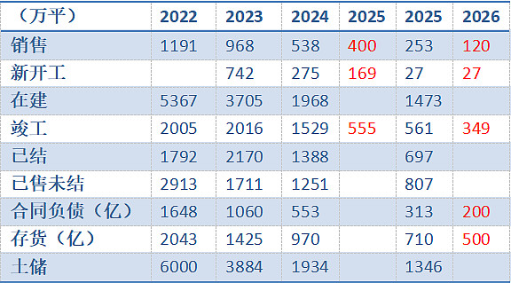 销售方面26年直接就按每月10万平,全年120万来算,到了这样的低位就算有偏差也不会大;新开工27万平基本可以忽略不计,基本26年建安成本就看预计竣工面积349万,相当于25年的62%;下面合同负债和存货是缩表过程中大家最关注的两项,简单推一下后面这个两个指标的演变情况,26年合同负债按313-229(现房)+100(26年销售额)=184亿,26年年报中合同负债有望低于200亿,同时26年349万平竣工大多成为了26年底现房,大约有200亿,27年合同负债按184-200+100=84亿,基本上两年后在住开逐渐退出的情况合同负债就可以按上一年的销售额维持在百亿上下。