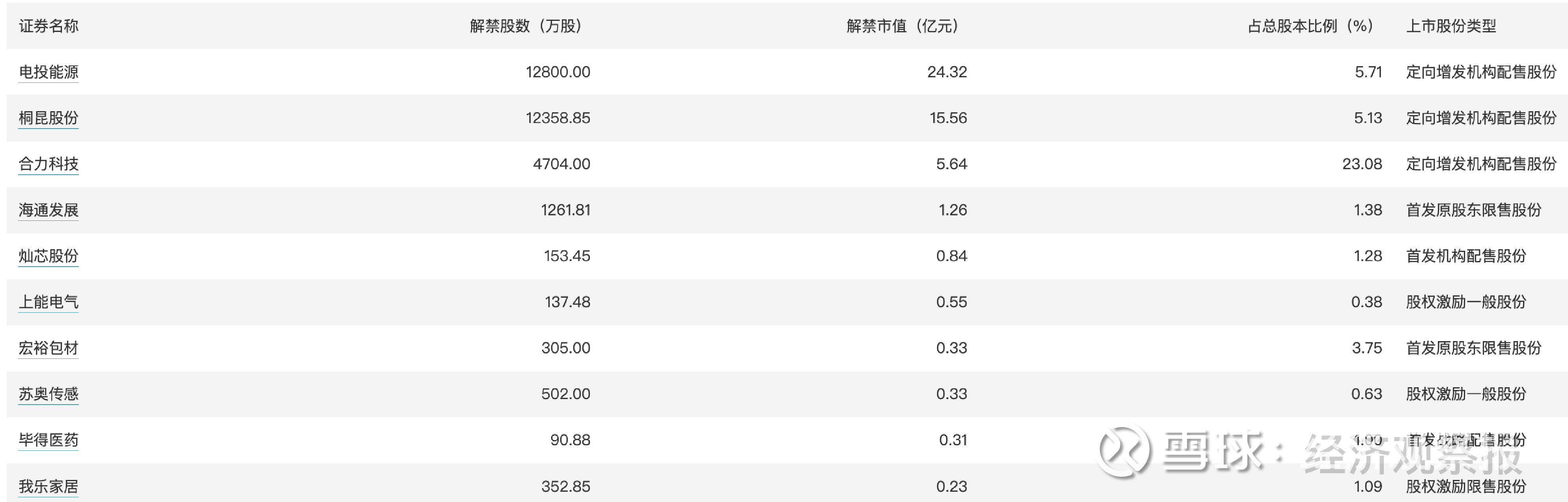 从解禁量来看,4家公司解禁股数超千万股。电投能源、桐昆股份、合力科技解禁量居前,解禁股数分别为1.28亿股、1.24亿股、4704.0万股。从解禁市值来看,4家公司解禁股数超亿元。电投能源、桐昆股份、合力科技解禁市值居前,解禁市值分别为24.32亿元、15.56亿元、5.64亿元。从解禁股数占总股本比例来看,1家公司解禁比例超10%。合力科技、电投能源、桐昆股份解禁比例居前,解禁比例分别为23.08%、5.71%、5.13%。