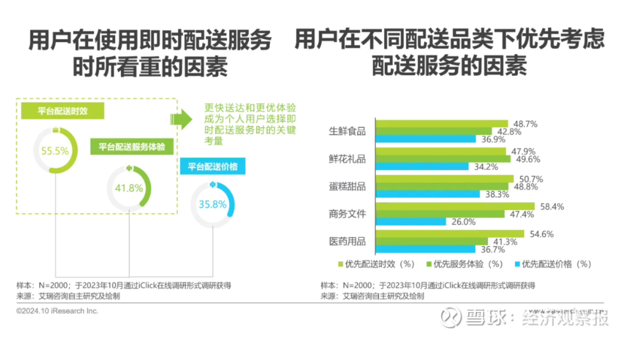 根据艾瑞在2023年10月开展的用户调研,用户主动使用即配服务时看重的前三个因素依次是:平台配送时效(55.5%)、配送服务体验(41.8%)和平台配送价格(35.8%)。