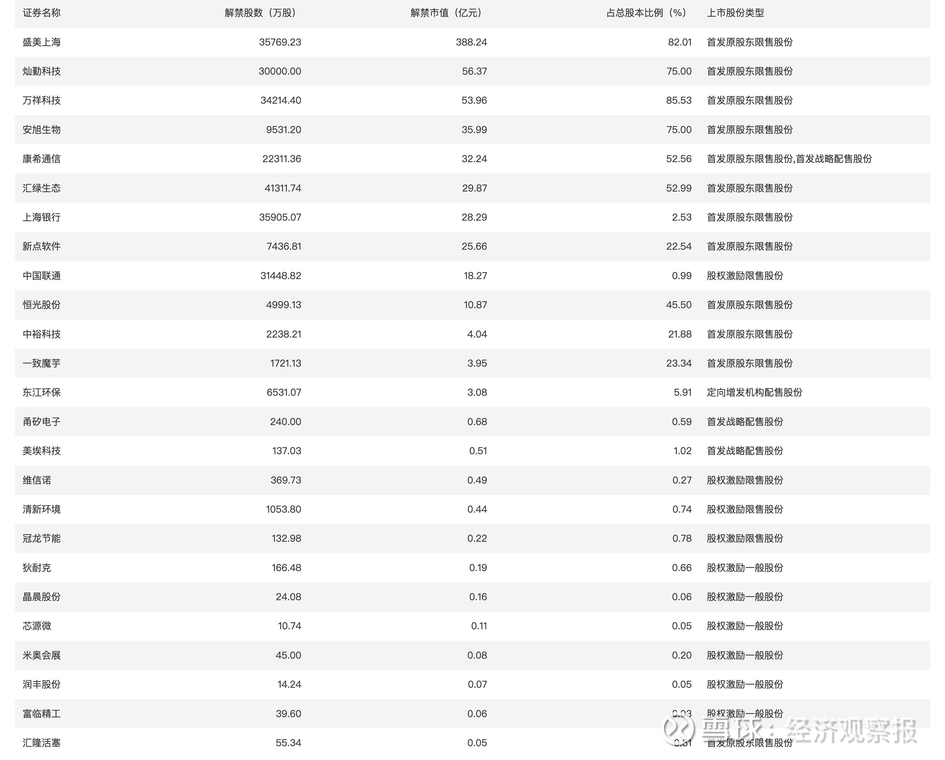 从解禁量来看,14家公司解禁股数超千万股。汇绿生态、上海银行、盛美上海解禁量居前,解禁股数分别为4.13亿股、3.59亿股、3.58亿股。从解禁市值来看,14家公司解禁股数超亿元。盛美上海、灿勤科技、万祥科技解禁市值居前,解禁市值分别为388.24亿元、56.37亿元、53.96亿元。从解禁股数占总股本比例来看,10家公司解禁比例超10%。万祥科技、盛美上海、灿勤科技解禁比例居前,解禁比例分别为85.53%、82.01%、75.0%。