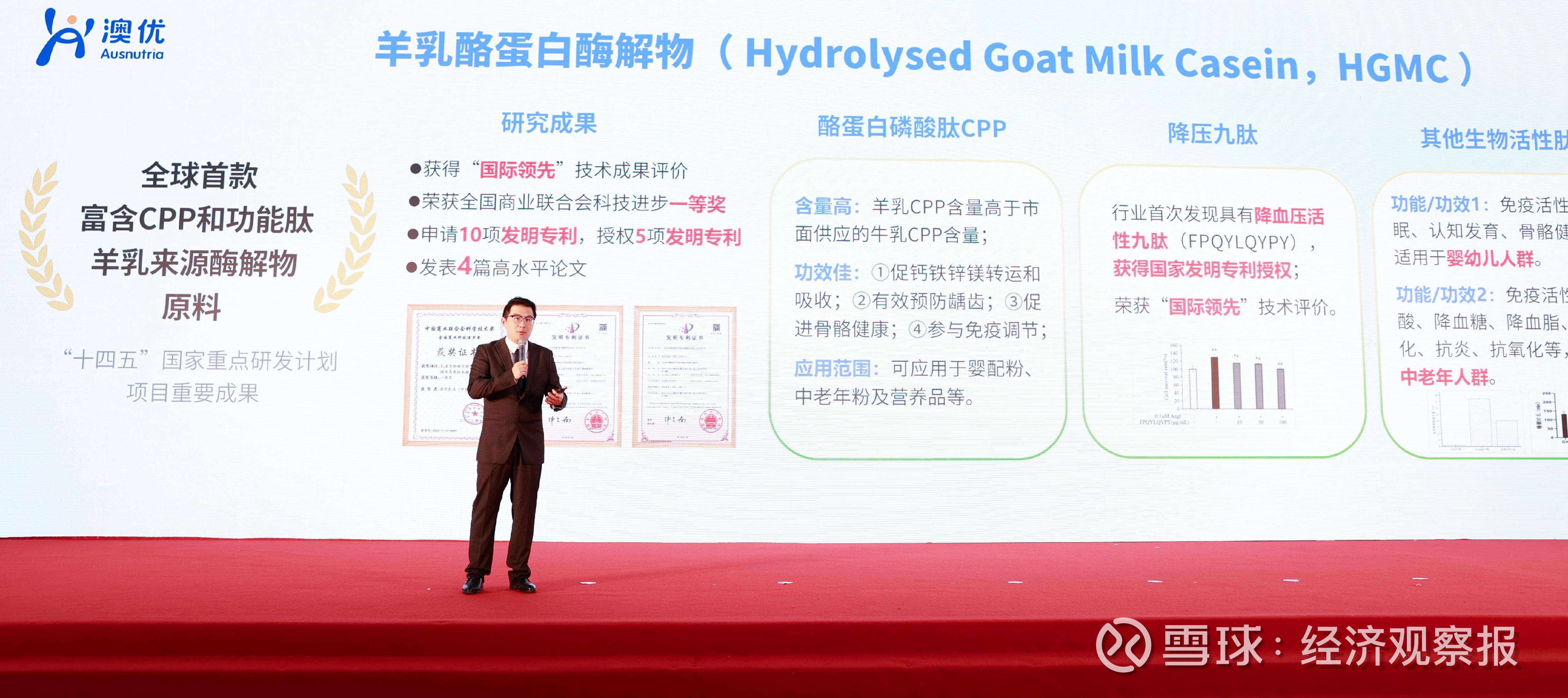 以其中羊乳酪蛋白酶解物为例,羊乳清蛋白是婴幼儿配方羊奶粉的核心配料,但是在其生产中会分离得到大量的副产物——羊乳酪蛋白。如何让低附加值的羊乳酪蛋白转化为高值功能性原料?澳优的研究就此展开。经研究发现,经过澳优特有酶解工艺技术,羊乳酪蛋白可以释放更高含量的酪蛋白磷酸肽和生物活性肽,具有促骨生长、抗氧化、降三高、降尿酸、提高免疫力和降低炎症等多种功能。经此获取的羊乳酪蛋白酶解物和羊乳CPP原料,可以应用于婴配粉、儿童奶粉、成人及中老年奶粉、营养品等产品中,可以满足不同人群的多样化需求。