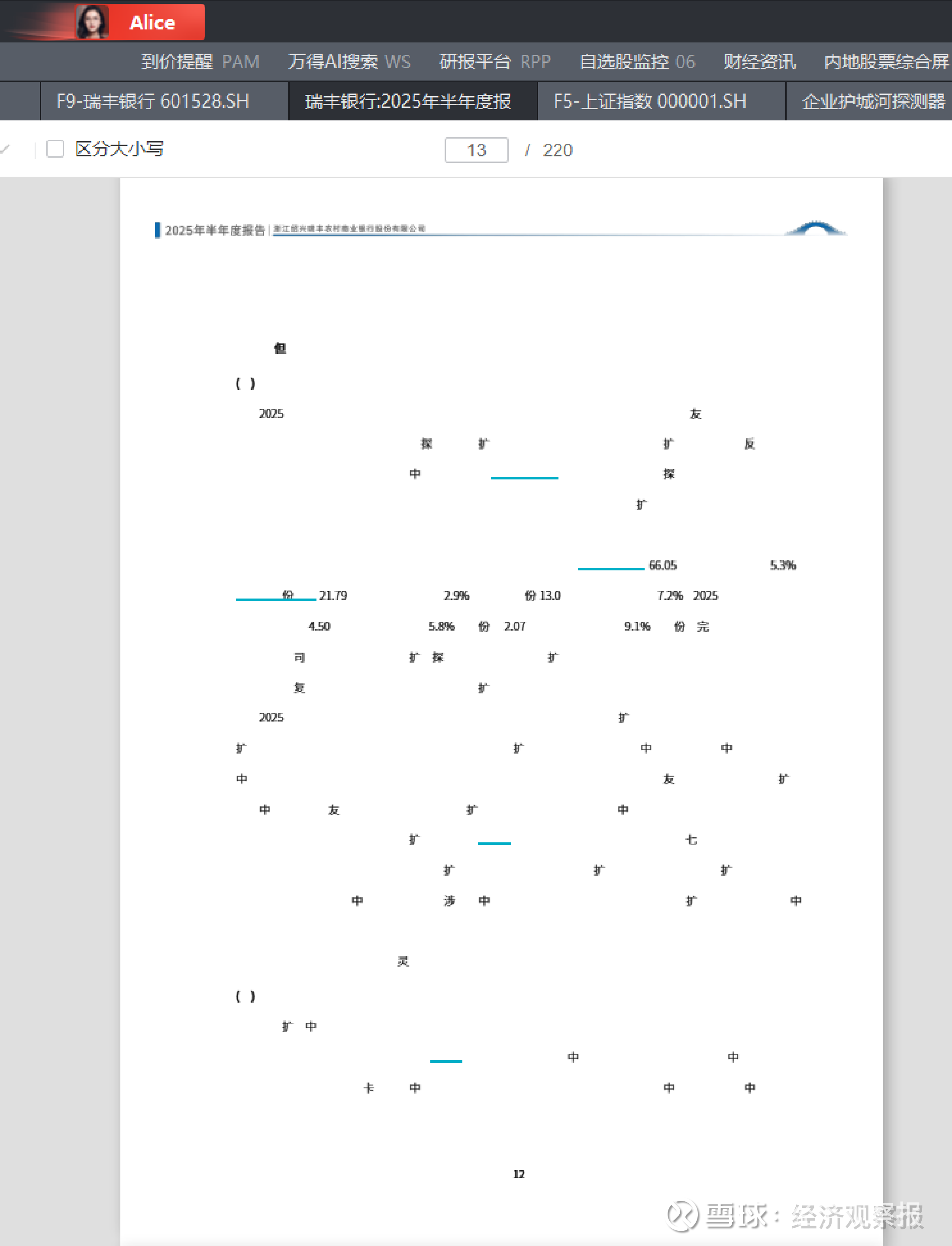 8月26日晚间,瑞丰银行(601528.SH)发布了2025年半年度报告。8月27日早上,经济观察报记者发现,从新浪财经和巨潮资讯网等三方平台下载的瑞丰银行半年报,以及在Wind平台的瑞丰银行半年报原文链接中,均有几十页显示为“乱码”。