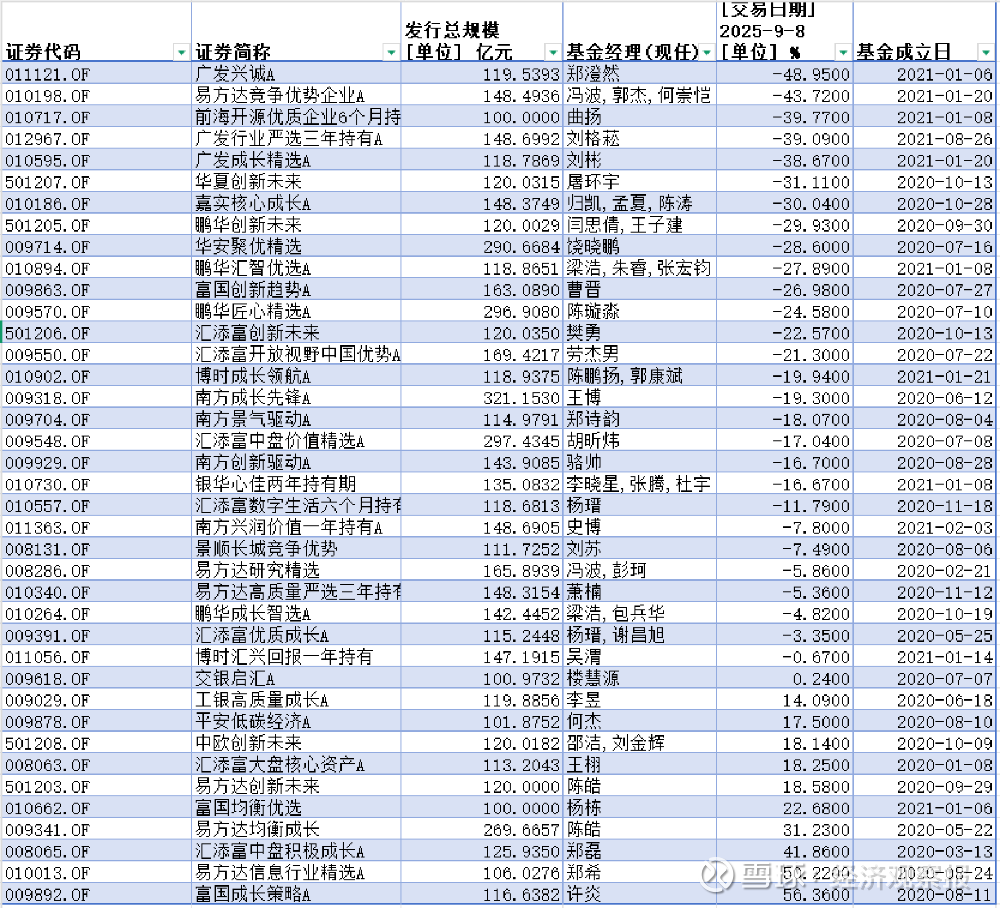 经济观察报根据Wind数据统计发现,爆款基金常出现在市场阶段性高点,而从过往业绩表现看,后续往往不及预期。例如,2020年至2021年发行的多只百亿基金,仍有不少爆款产品成立至今依然为负收益。(如下图)