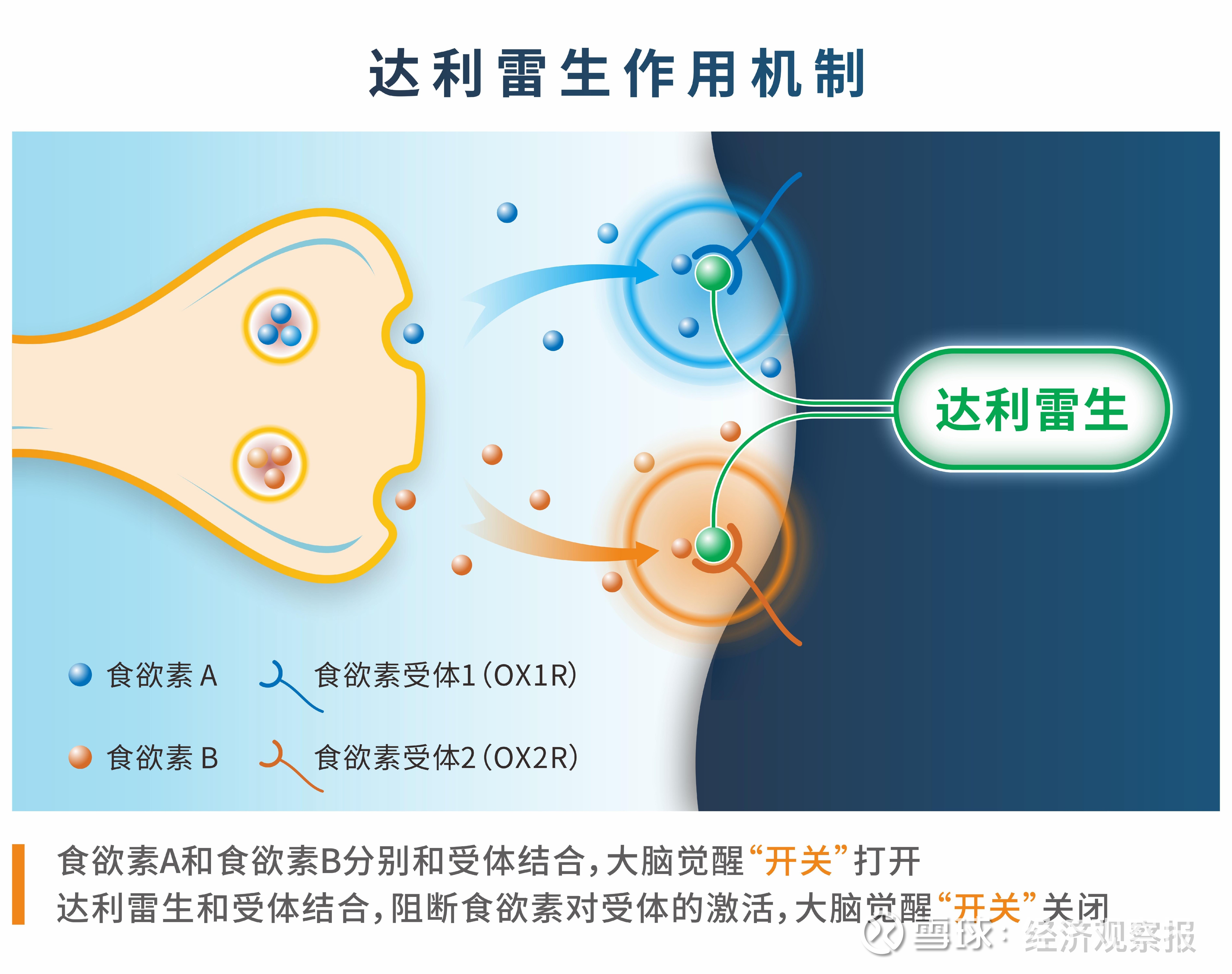 基于这一发现,瑞士Idorsia率先开始研发针对食欲素系统的药物,经过20多年不懈努力,于2022年在美国上市新型抗失眠药达利雷生。它作为一种双食欲素受体拮抗剂(DORA),能够精准阻断食欲素与其受体的结合,降低失眠患者异常升高的食欲素水平,从而诱导自然睡眠。