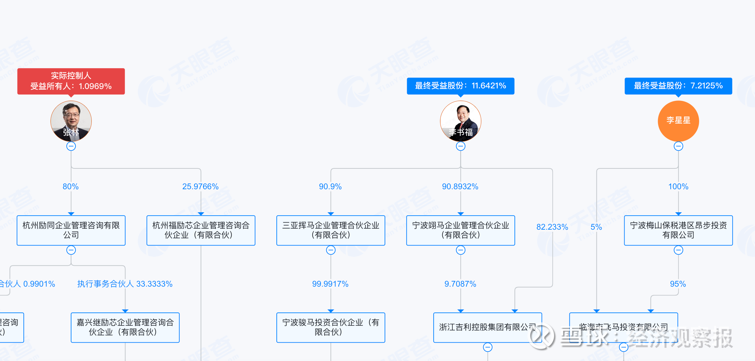 根据天眼查穿透信息,李书福及其子李星星合计持有公司近 20% 的受益股份,是福瑞泰克最大的经济受益方之一。