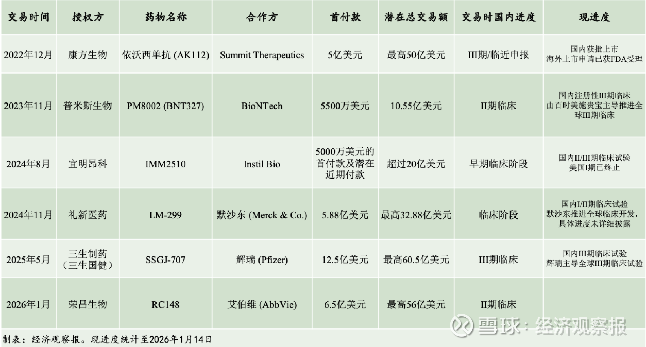 此外,2026年1月6日,宜明昂科宣布终止与Instil Bio的交易,收回了其PD-L1/VEGF药物的海外权益。宜明昂科这项交易在2024年8月达成,当时约定首付款及潜在近期付款为5000万美元,里程碑付款有望超过20亿美元。但截至协议终止,宜明昂科仅收到3500万美元,不足其余公开交易首付款的十分之一,且开发进度停滞。